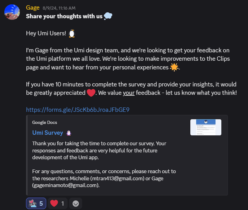 Our user research involved chatting with language learners outside boba shops and mall food courts to surveying Umi's already established Discord server for real user feedback.